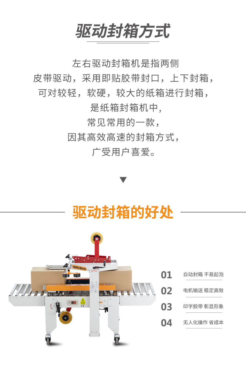 左右驱动封箱机GPA-50是两侧皮带驱动,采用即贴胶带封口,封箱效果平整。可根据纸箱规格,手工调节宽度与高度,简单,快捷,方便 可替代人工,是企业节省成本,提高生产效率的理想选择。该款封箱机广泛应用于食品、医药、玩具、烟草、日化、电子等行业。